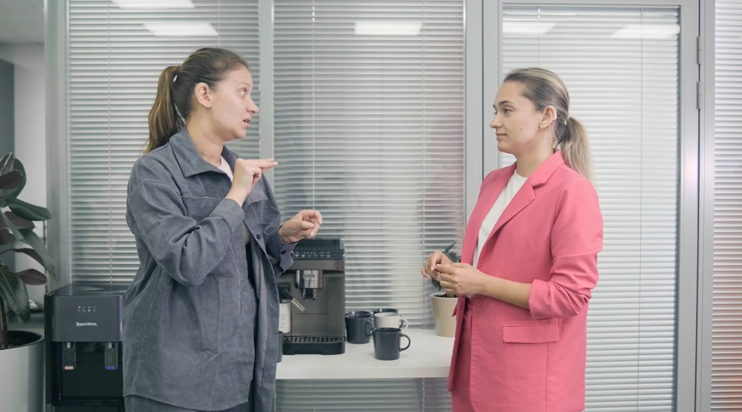 Две неслышащие девушки стоя друг напротив друга, разговаривают на жестовом языке.