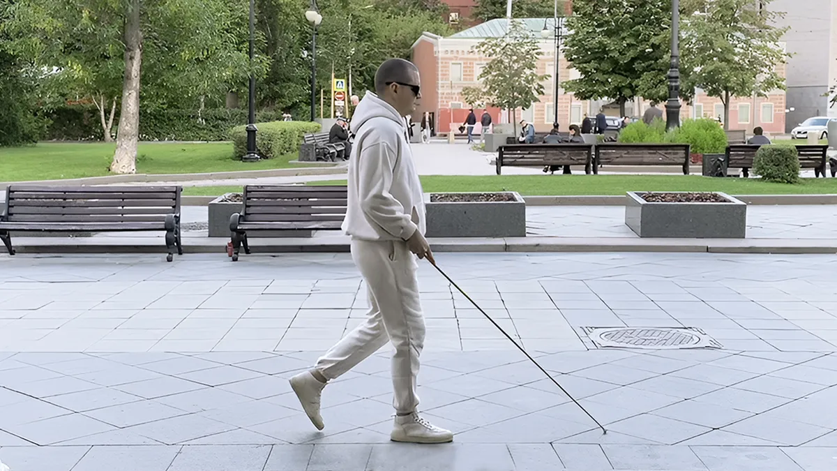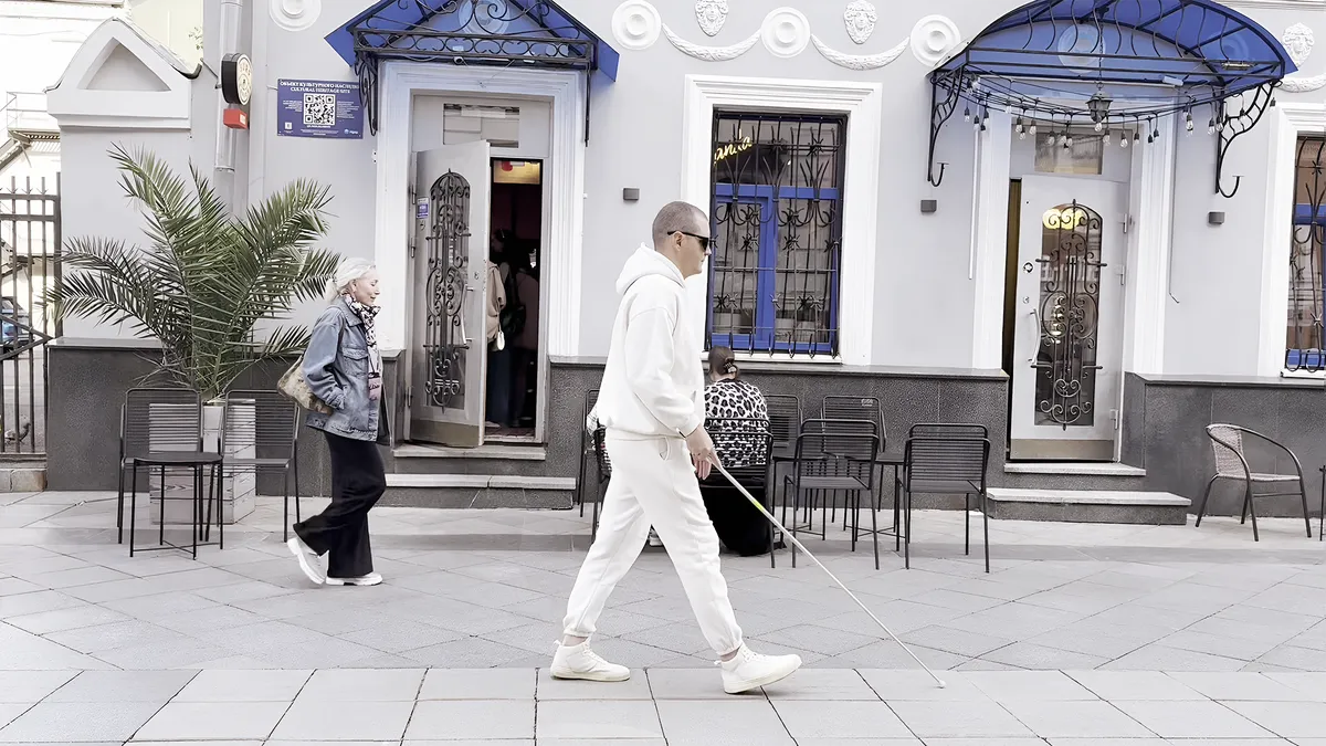 Незрячий мужчина в темных очках с белой тростью в руке идет по улице.