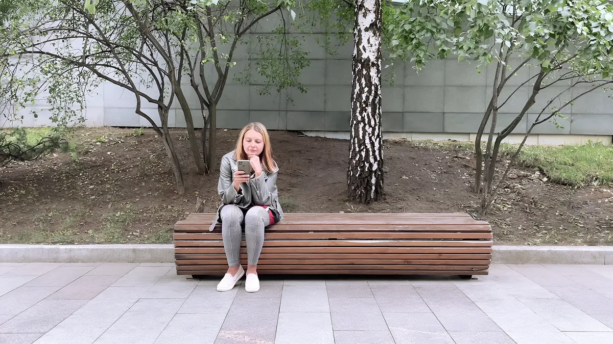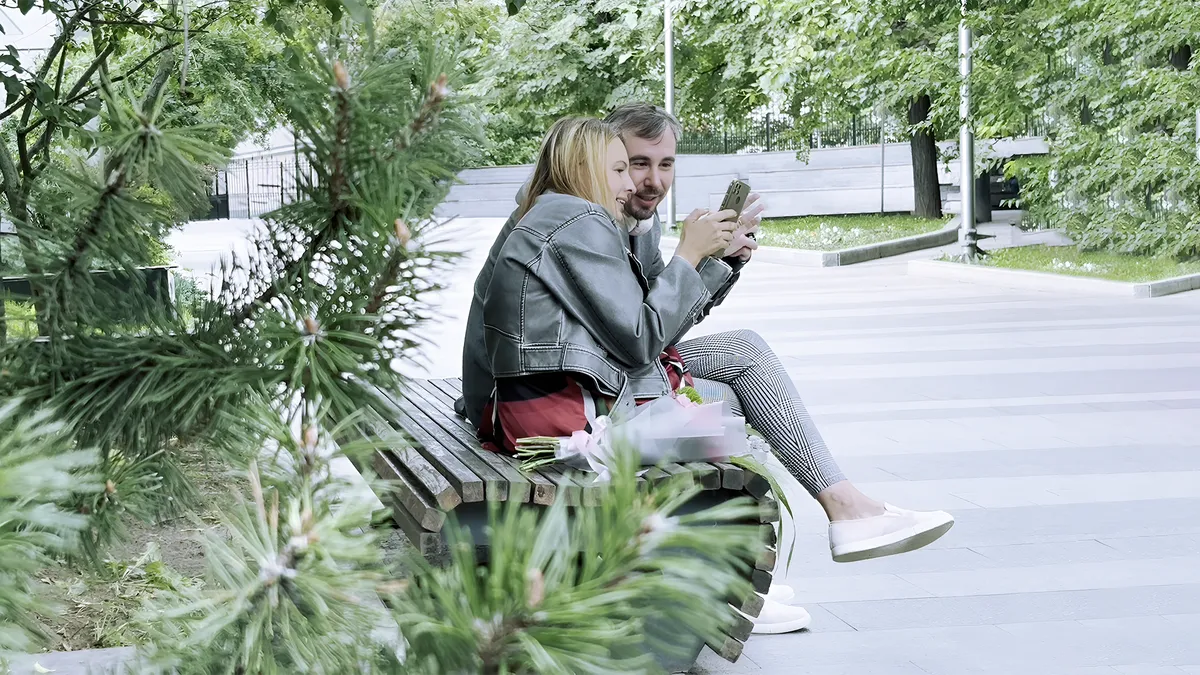 Мужчина с бионическим протезом руки дарит букет девушке, сидящей на скамейке. Затем они вместе смотрят на экран ее телефона.