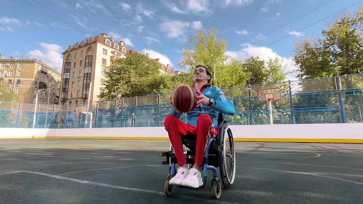 Мужчина передает баскетбольный мяч молодому человеку в инвалидной коляске, который бросает его в кольцо.