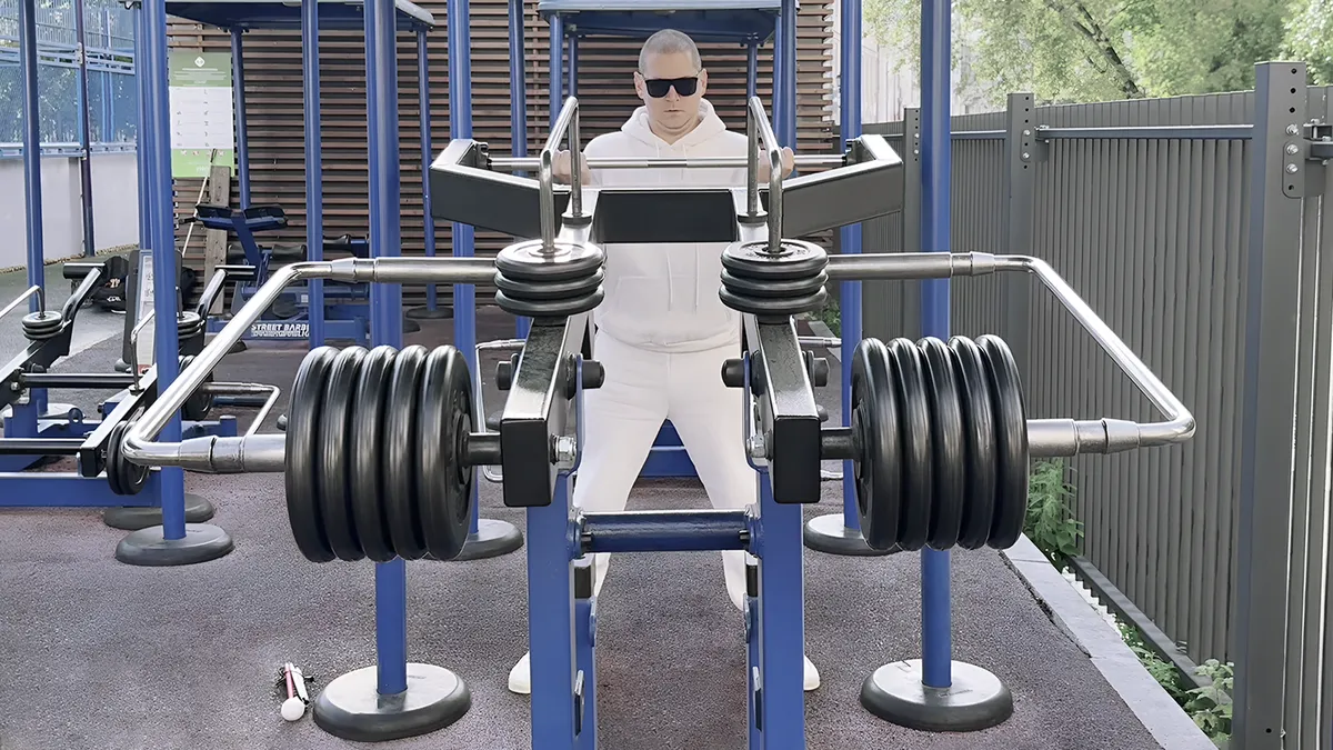 Незрячий мужчина в темных очках складывает белую трость в руке, делает разминку и выполняет упражнения на уличном тренажере.
