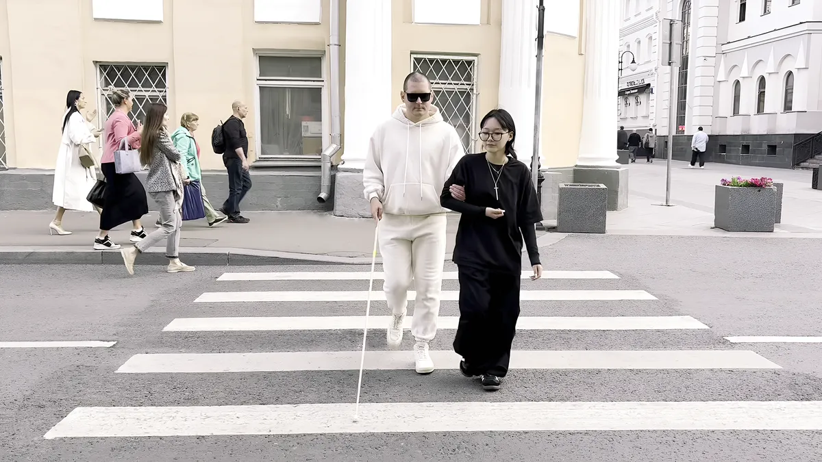Незрячий мужчина в темных очках с белой тростью в руке идет под руку с девушкой по пешеходному переходу.