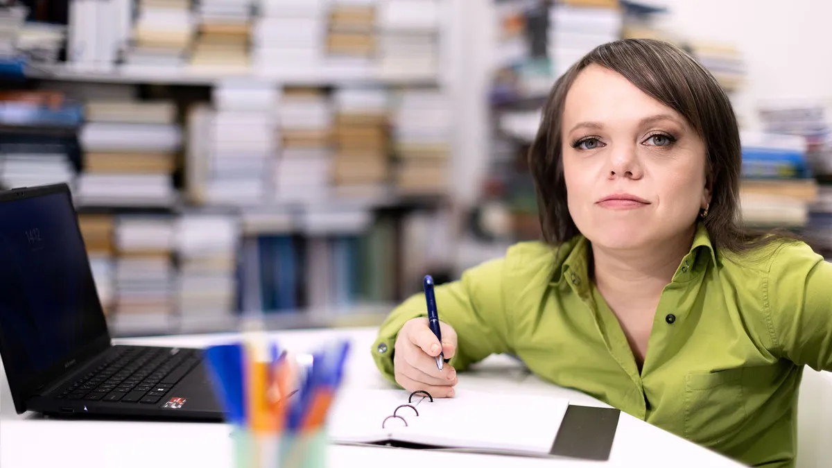 Девушка с нарушением опорно-двигательного аппарата сидит за столом перед открытым ежедневником, в ее руке — ручка.