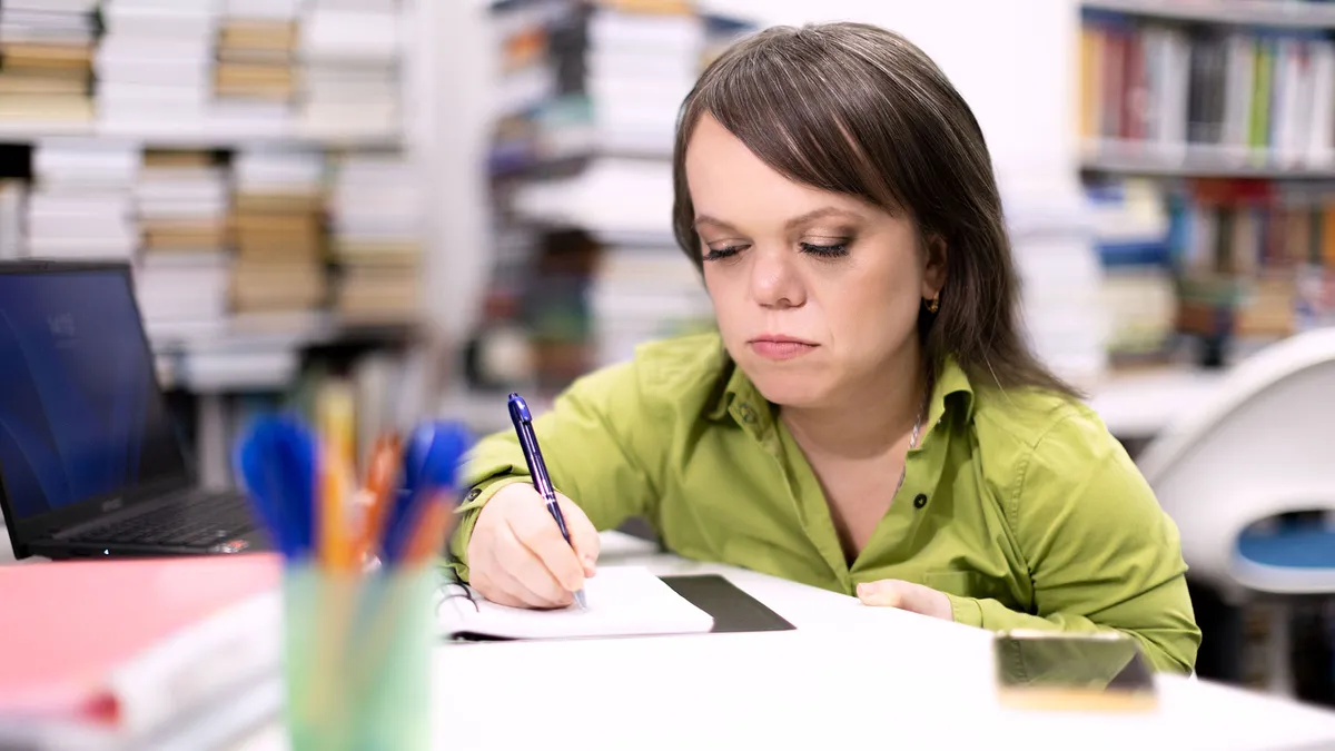 Девушка с нарушением опорно-двигательного аппарата записывает в ежедневник, сидя за столом.