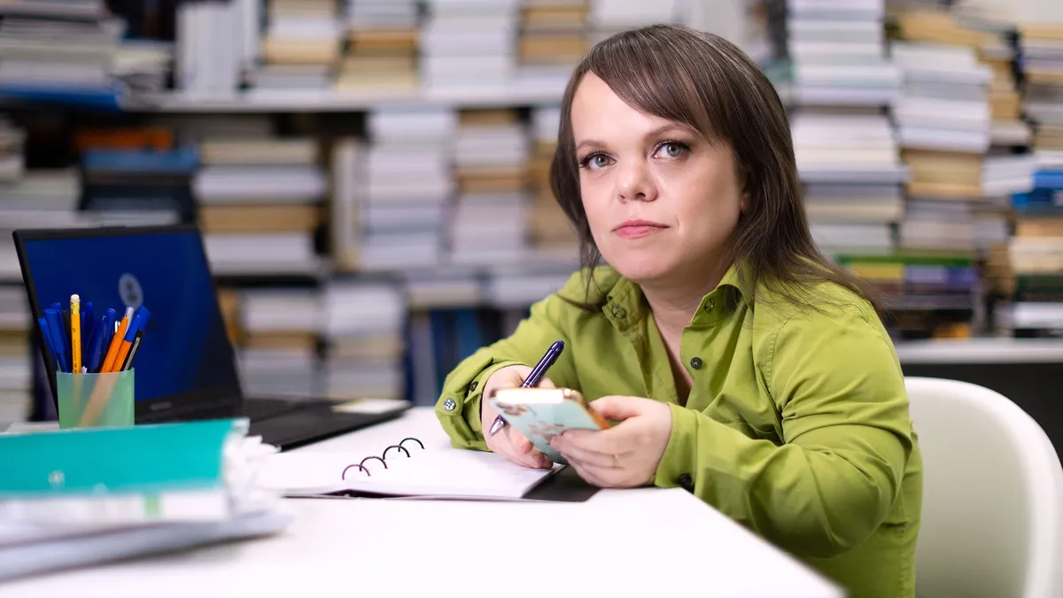 Девушка с нарушением опорно-двигательного аппарата сидит за столом и смотрит вперед, в ее руках ручка и телефон. На столе включенный ноутбук, папка с документами и ежедневник.