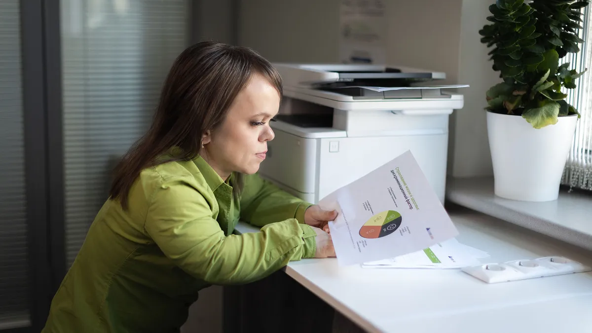 Девушка с нарушением опорно-двигательного аппарата изучает документы, стоя у стола.