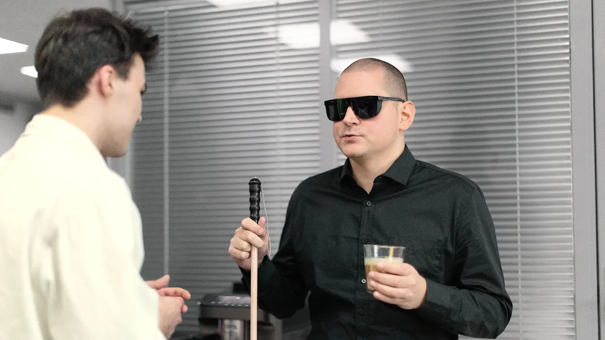 Двое мужчин стоят друг напротив друга со стаканами в руках. Один из мужчин незрячий в темных очках с белой тростью в руке.