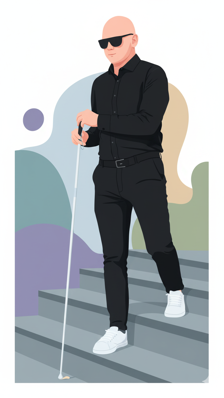 Незрячий мужчина в темных очках с белой тростью спускается по ступеням.