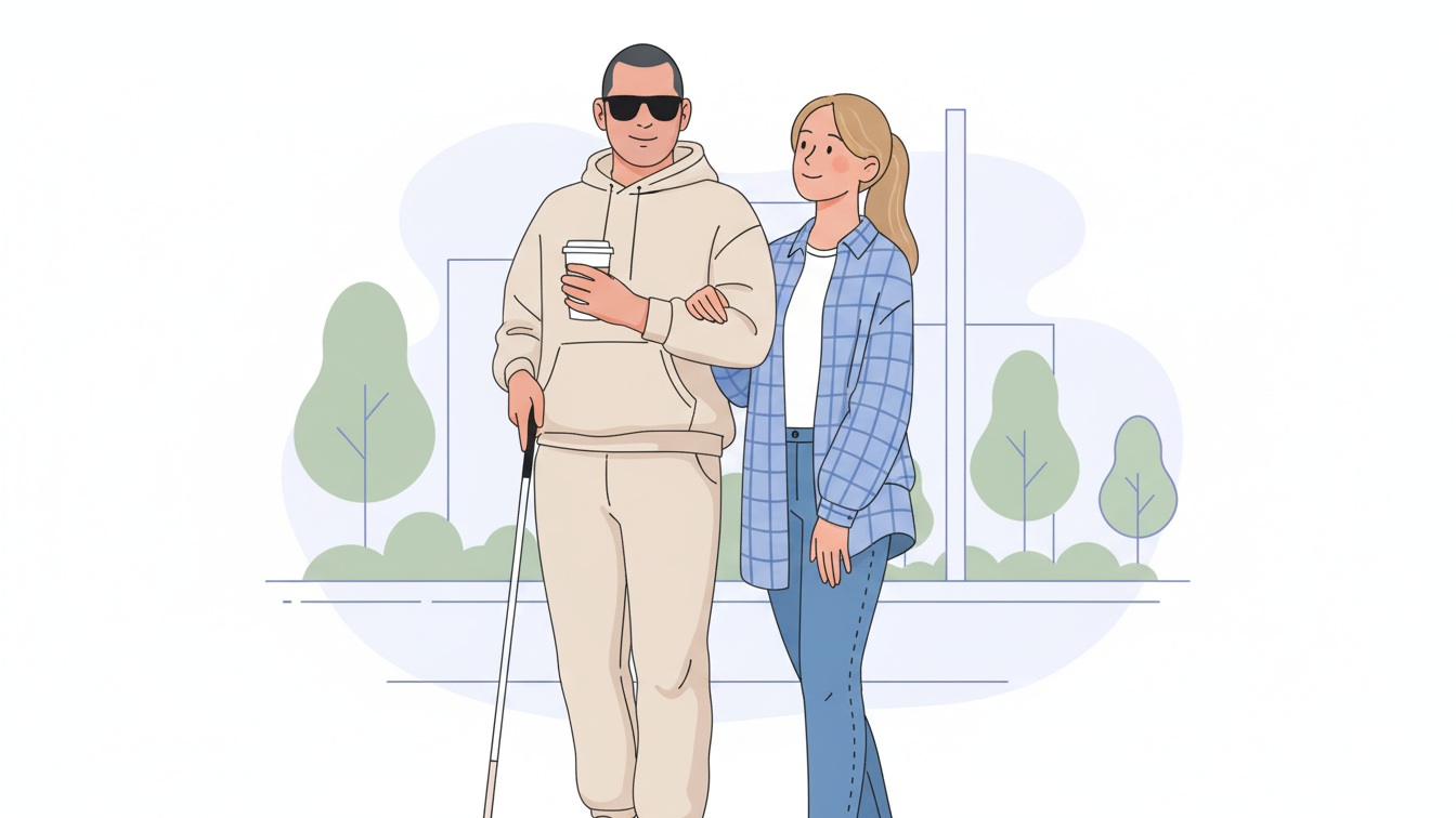 Незрячий мужчина в темных очках с белой тростью и девушка идут под руку.