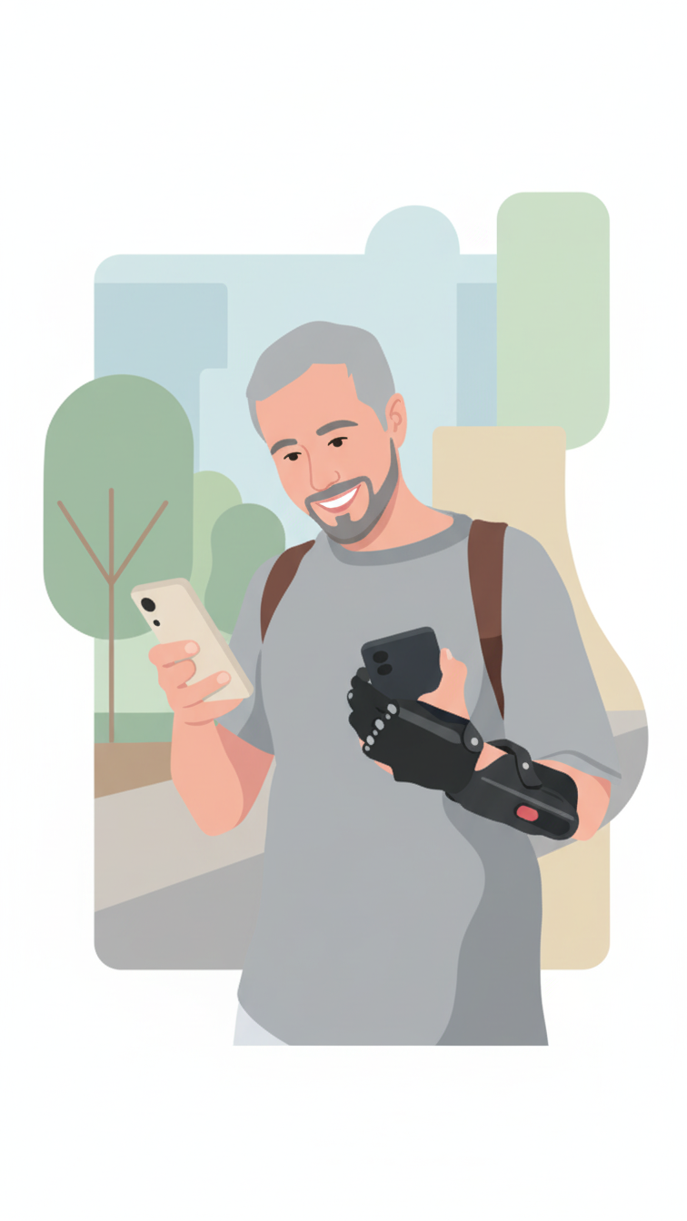 Мужчина на улице с бионическим протезом держит в обеих руках телефоны и улыбается.