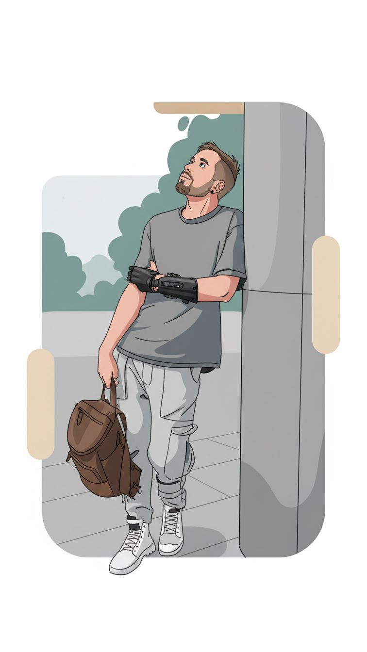 Мужчина с бионическим протезом стоит у колонны, держа в руке рюкзак.
