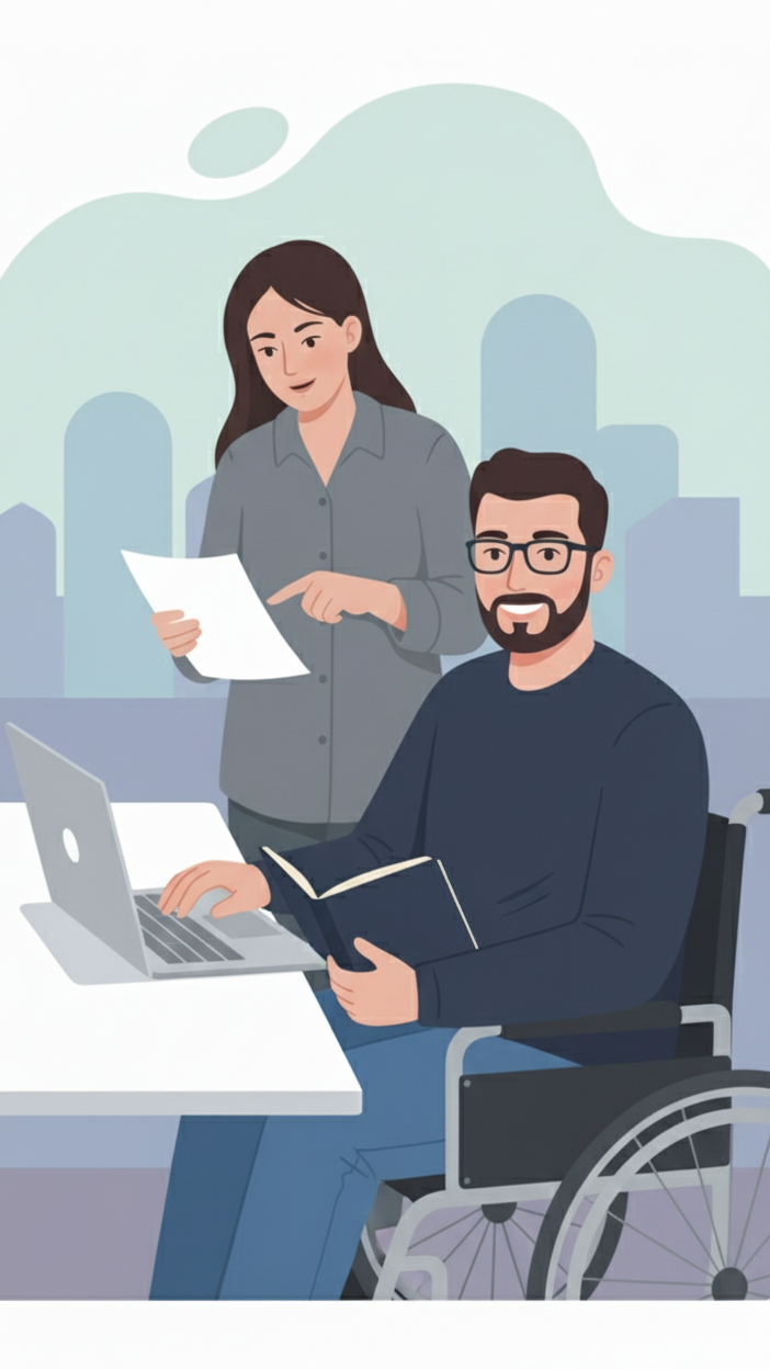 Мужчина в инвалидной коляске сидит за столом с открытым ноутбуком и блокнотом в руках. Рядом стоит девушка и показывает ему документы.