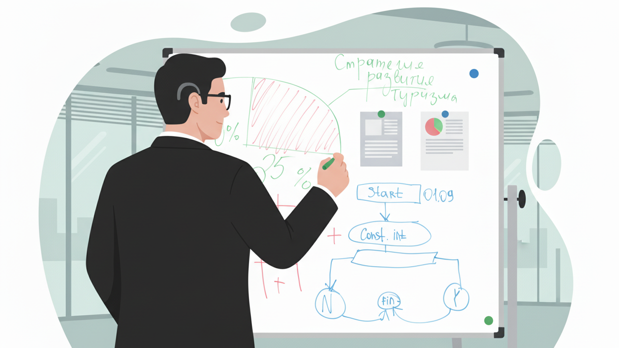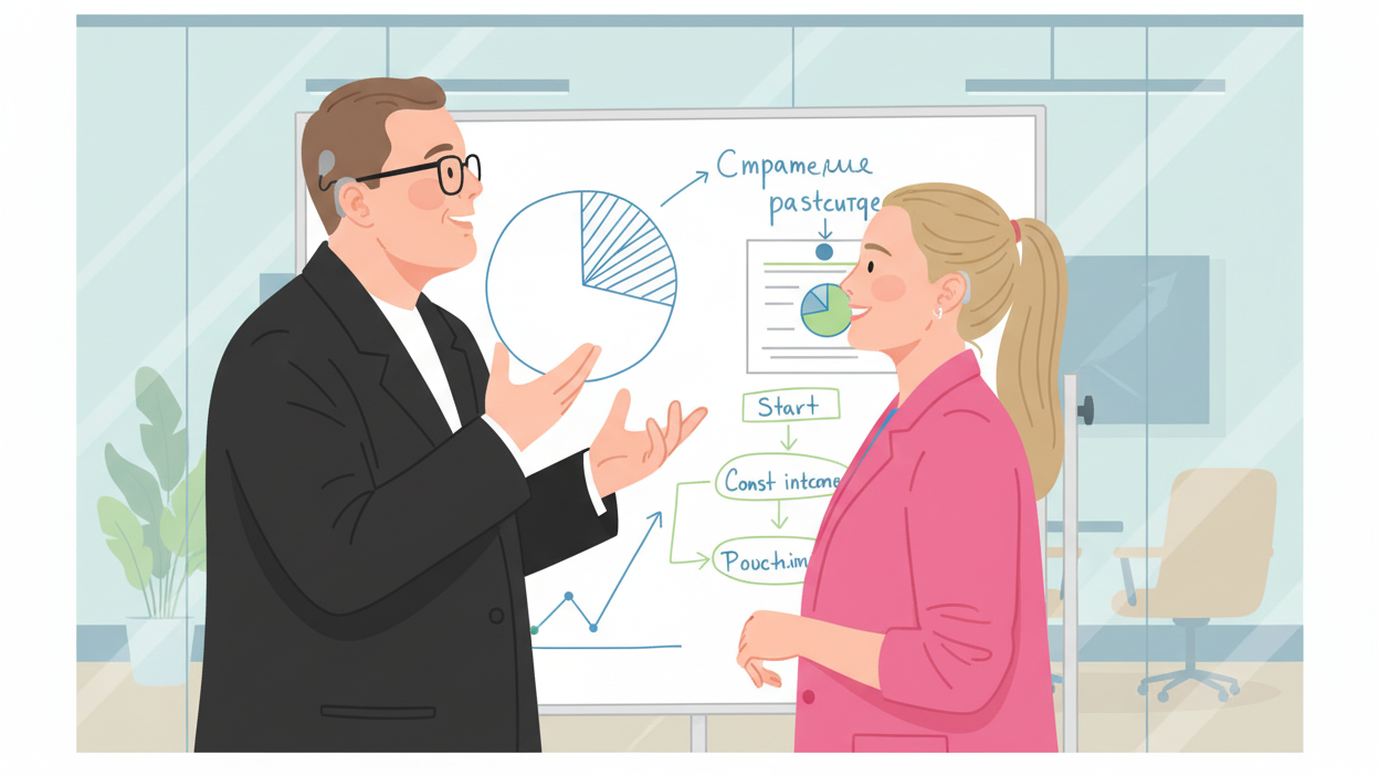 Неслышащий мужчина в очках с слуховым аппаратом стоит у магнитной доски с нарисованной схемой, протягивает руку вперед.