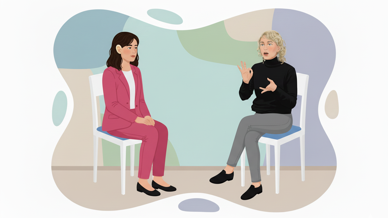 Неслышащая девушка со слуховым аппаратом смотрит на жестикулирующего женщину, сидящую напротив нее.