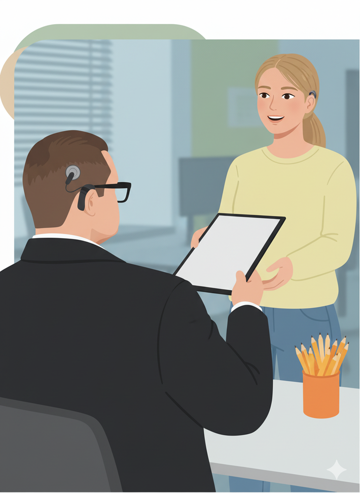 Мужчина в очках и с кохлеарным имплантом сидящий спиной к камере, передает лист бумаги девушке, стоящей напротив него.