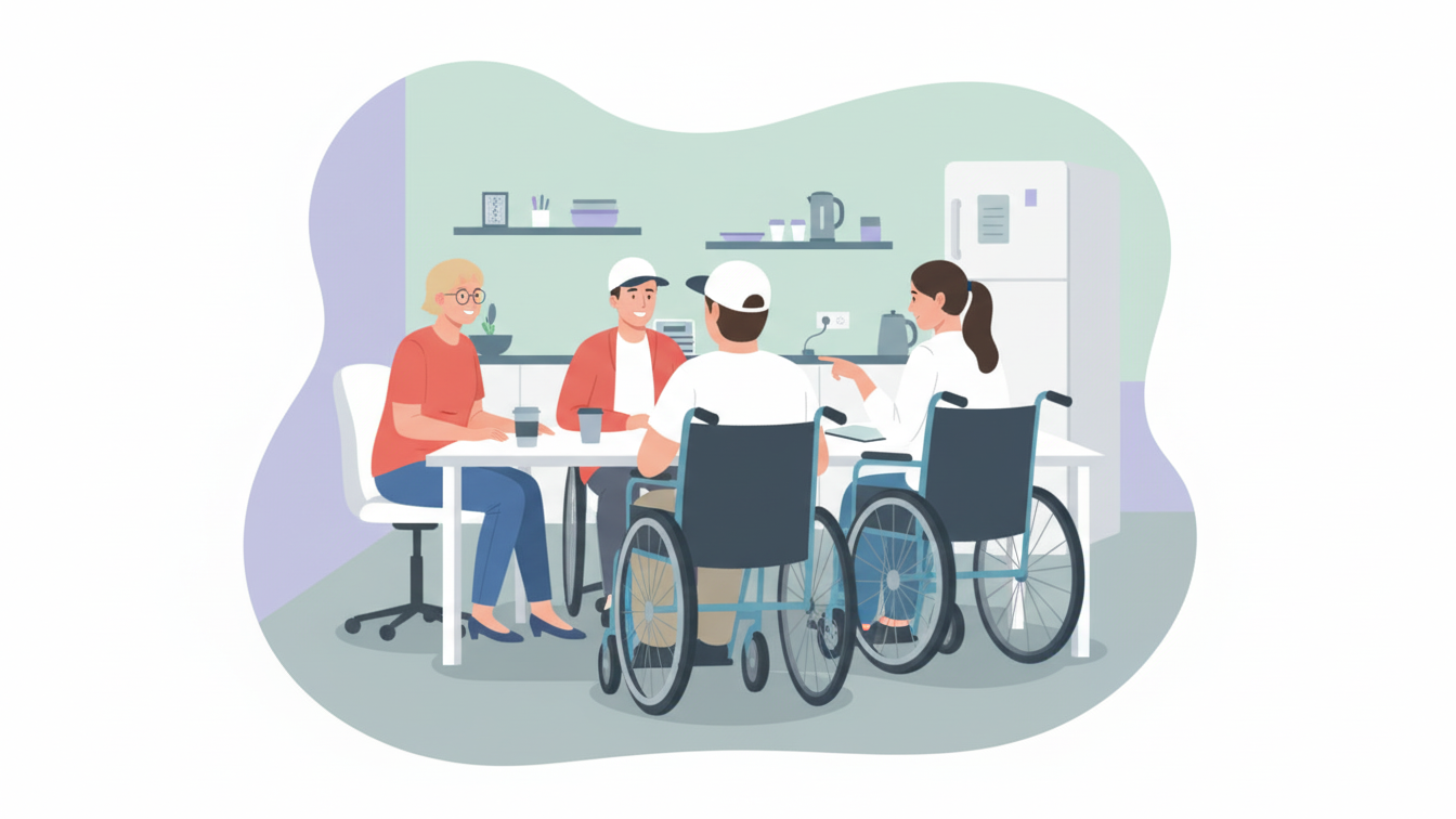 За столом на кухне сидят четыре человека. Трое из них в инвалидных колясках.