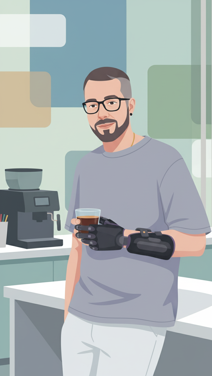 Мужчина с бородой в очках смотрит вперед. У него бионический протез, который держит стакан с жидкостью.