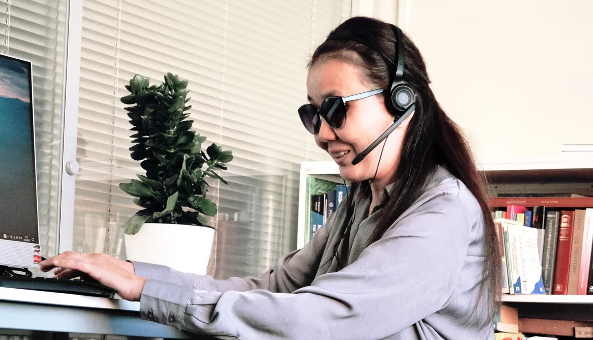 Незрячая девушка в темных очках с гарнитурой сидит перед монитором компьютера.