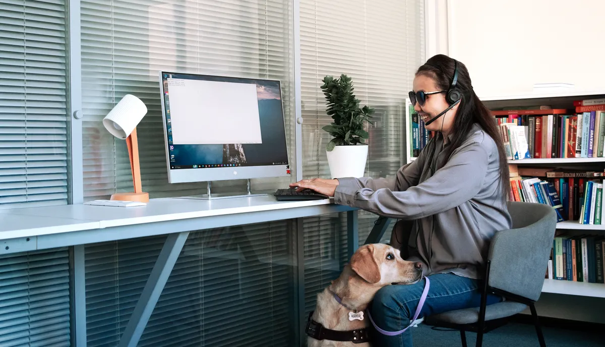 Незрячая девушка в темных очках с гарнитурой сидит за рабочим столом перед монитором, где идет видеоконференция. Сзади стоит мужчина. У ног девушки лежит собака-поводырь.