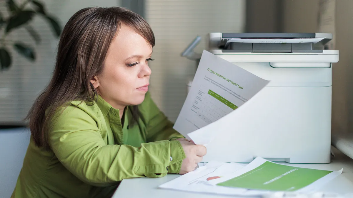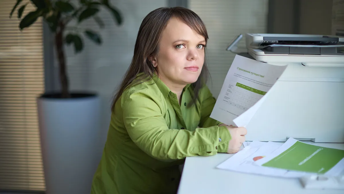 Девушка с нарушением опорно-двигательного аппарата сидит за столом и держит в руках документы.