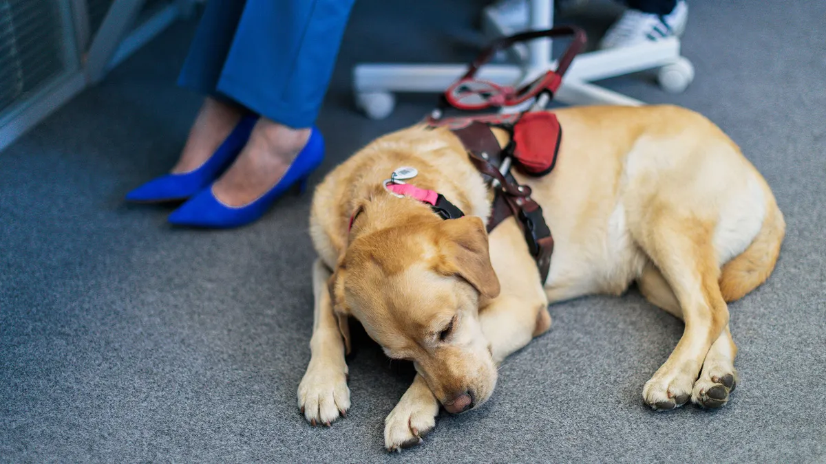 У ног незрячей девушки лежит собака-поводырь.