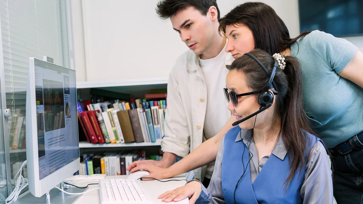 Незрячая девушка в темных очках с гарнитурой сидит у монитора. На экране открыта веб-страница. Сзади стоят мужчина и женщина. В руке женщины компьютерная мышь.