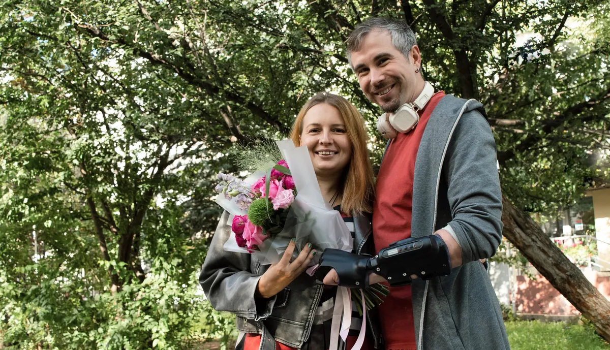 В парке стоят девушка с букетом цветов и мужчина с бионическим протезом руки.