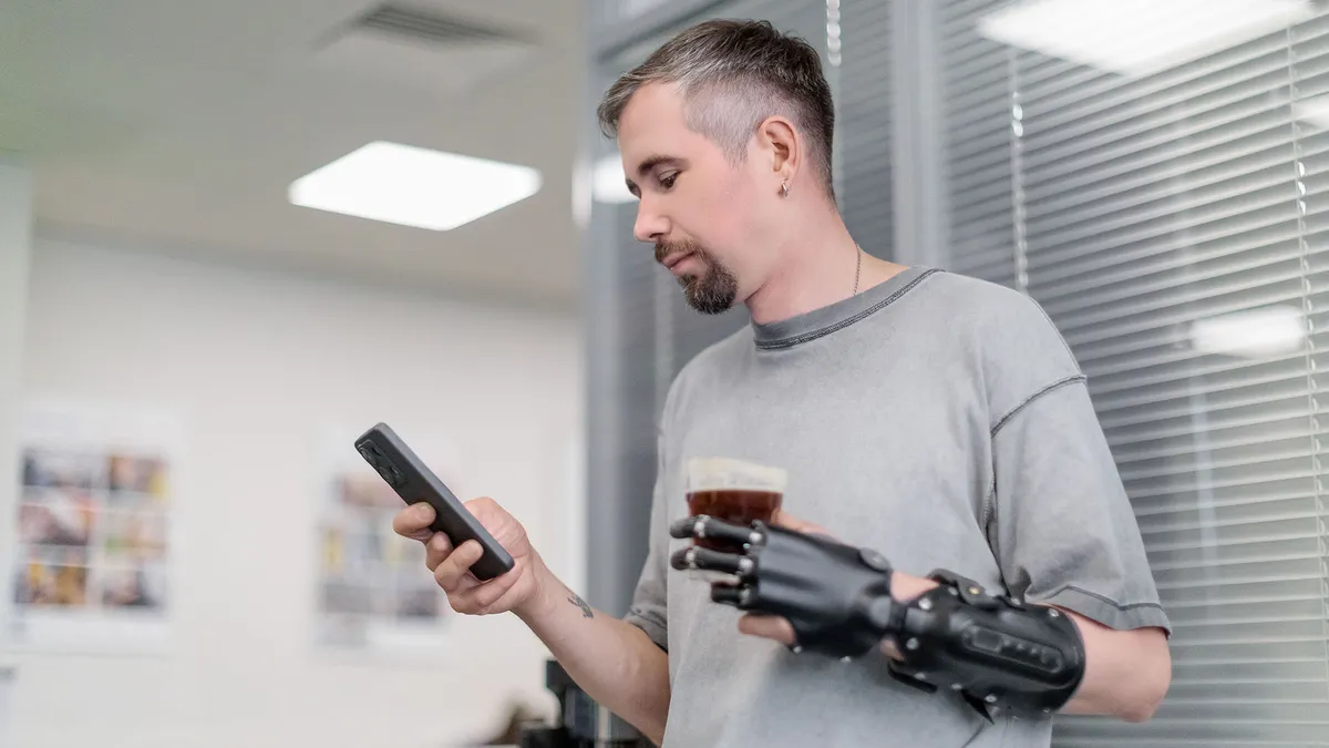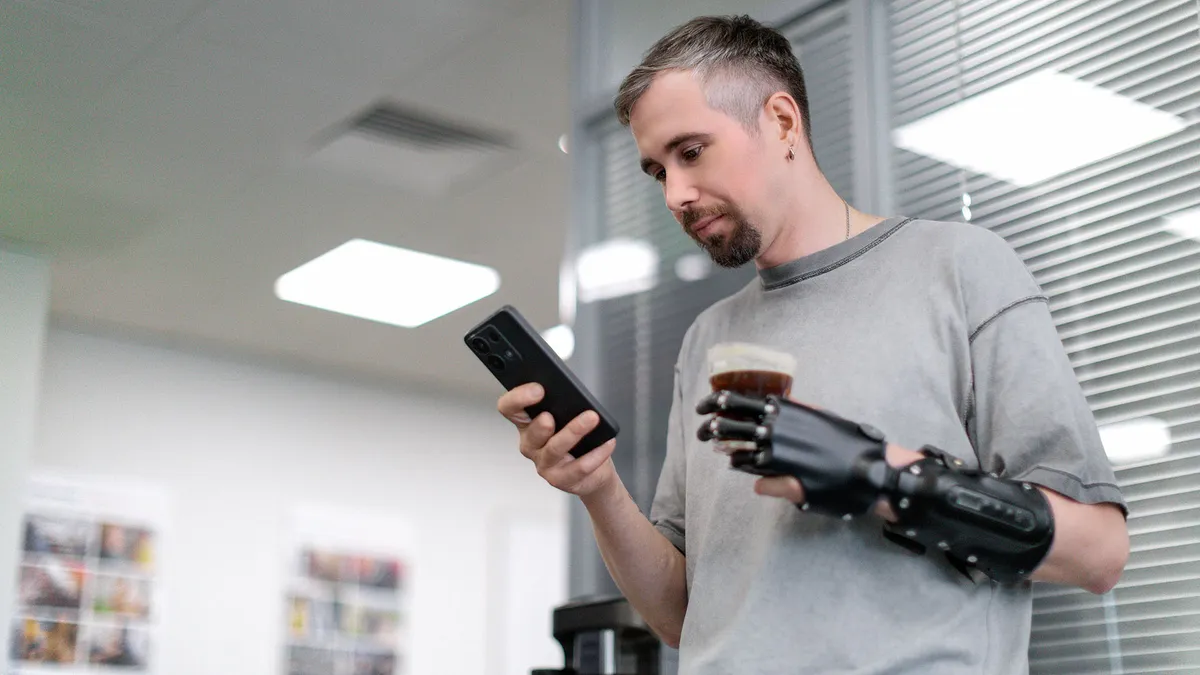 Мужчина с бионическим протезом руки держит стакан и смотрит в экран телефона.