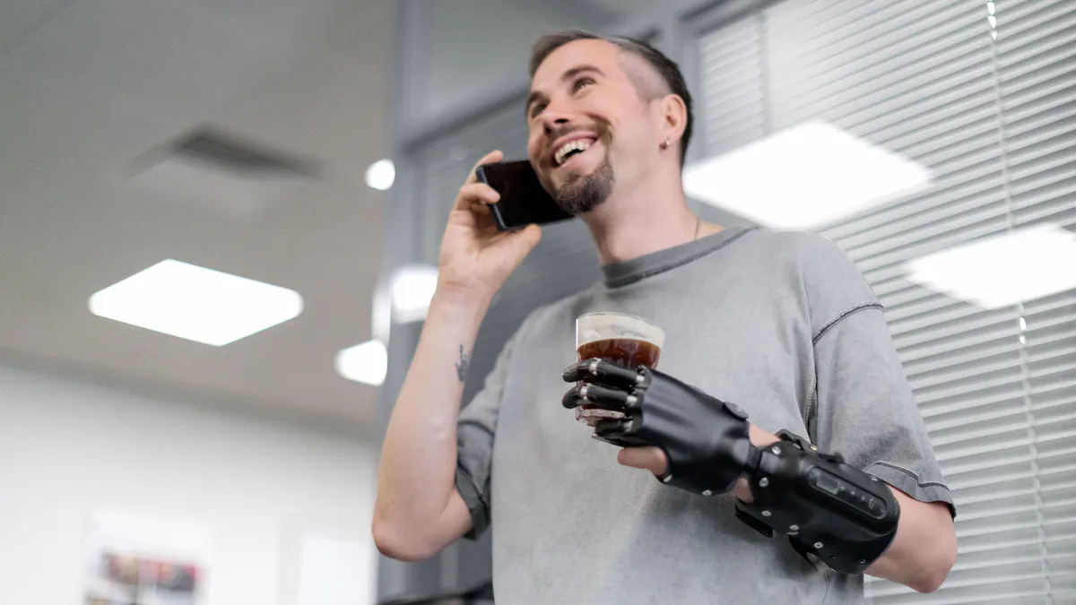 Улыбающийся мужчина с бионическим протезом, сжимающим стакан, разговаривает по телефону.