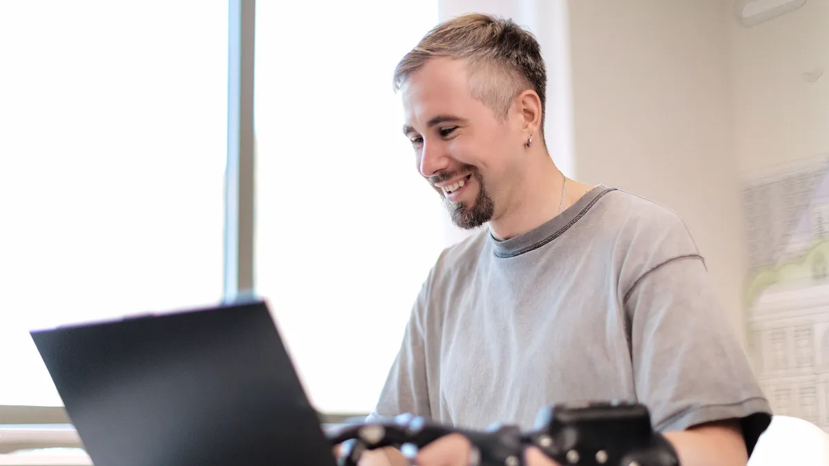Улыбающийся мужчина с бионическим протезом руки сидит перед ноутбуком.