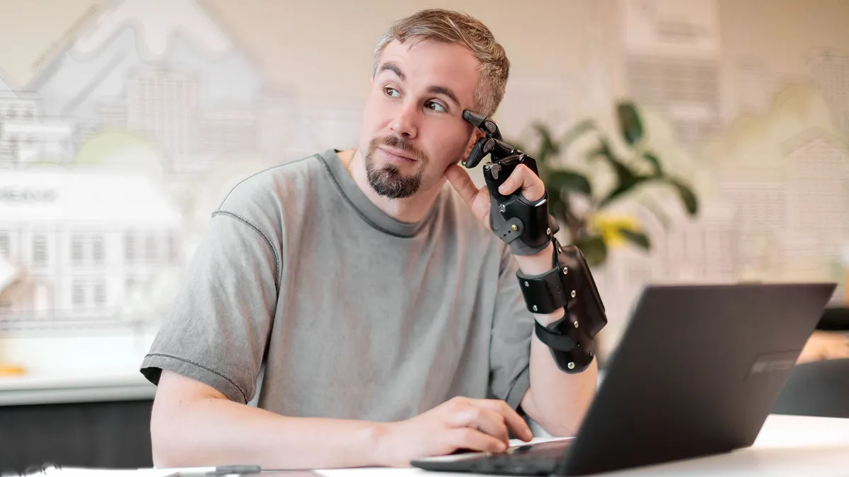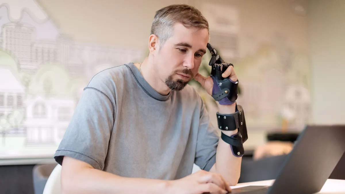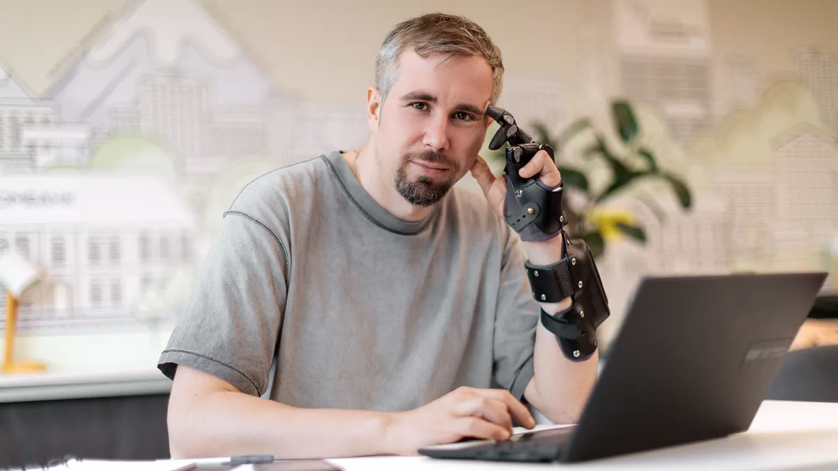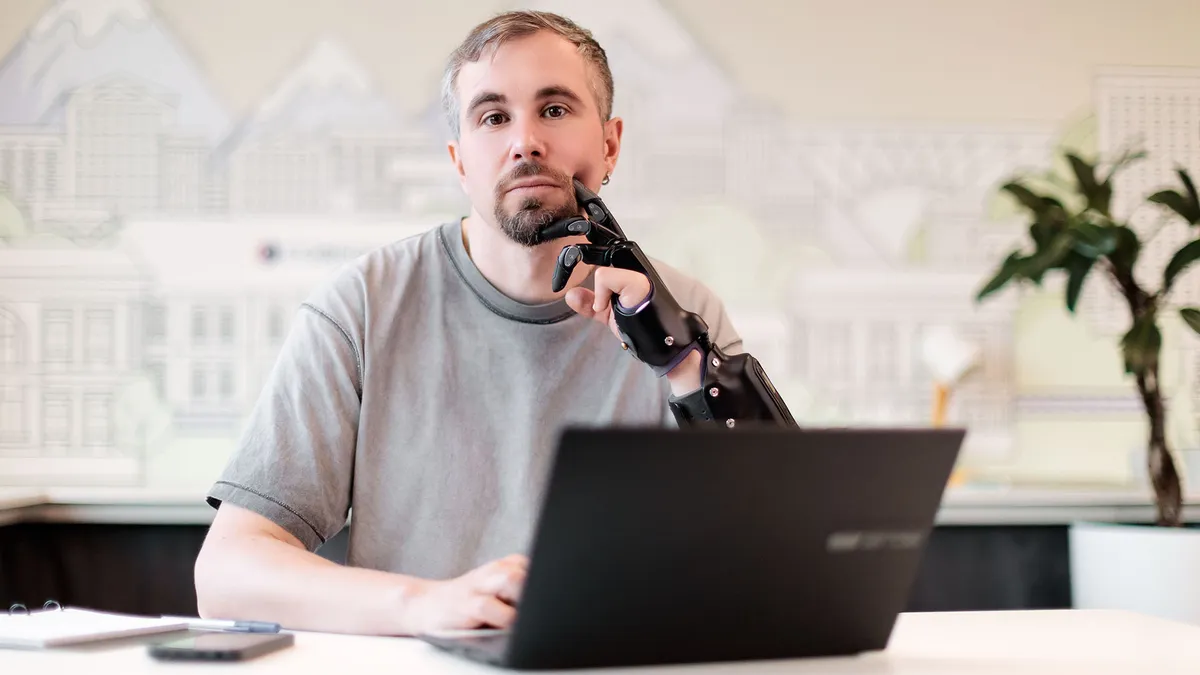 Мужчина с бионическим протезом руки сидит перед открытым ноутбуком и смотрит вперед.