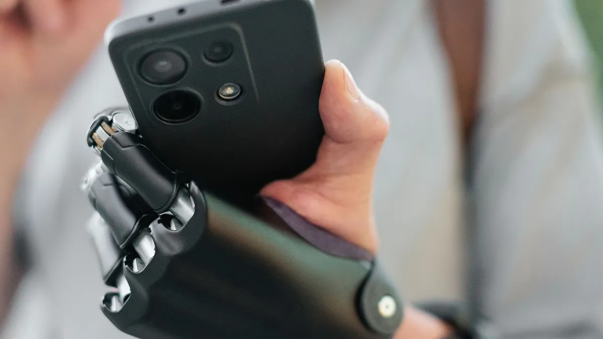 Мужчина смотрит в экран смартфона. У него бионический протез, который держит стакан.