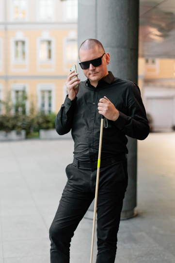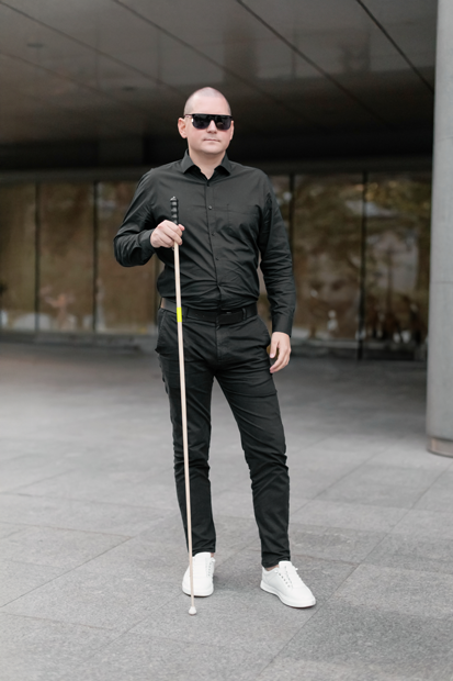 Незрячий мужчина в темных очках стоит с белой тростью в руке.